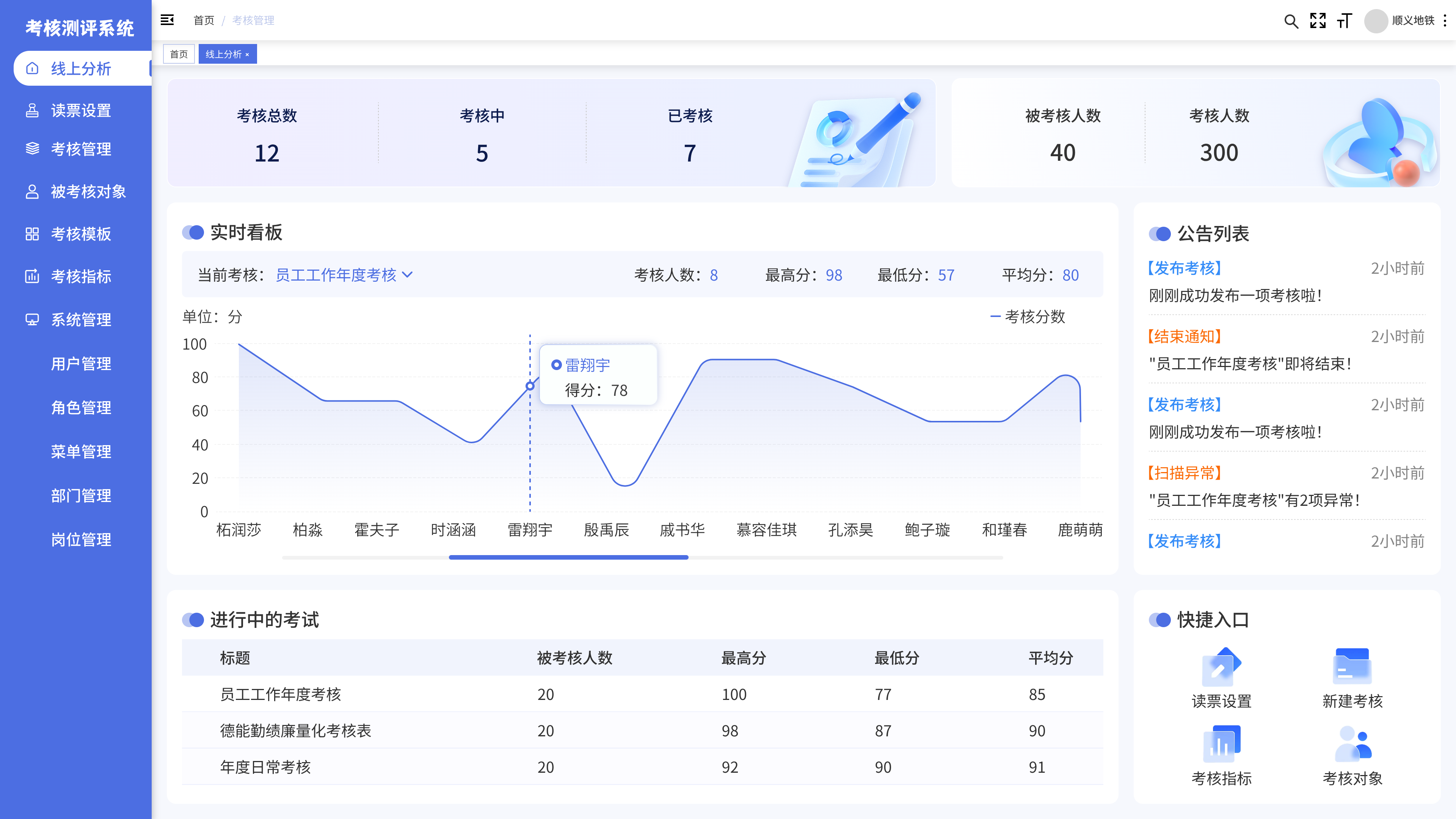 实时监控:实时查看考核进度(已测评人数、得分)、考核分数分布(最高分、最低分、平均分、中位数)、异常数据统计等;