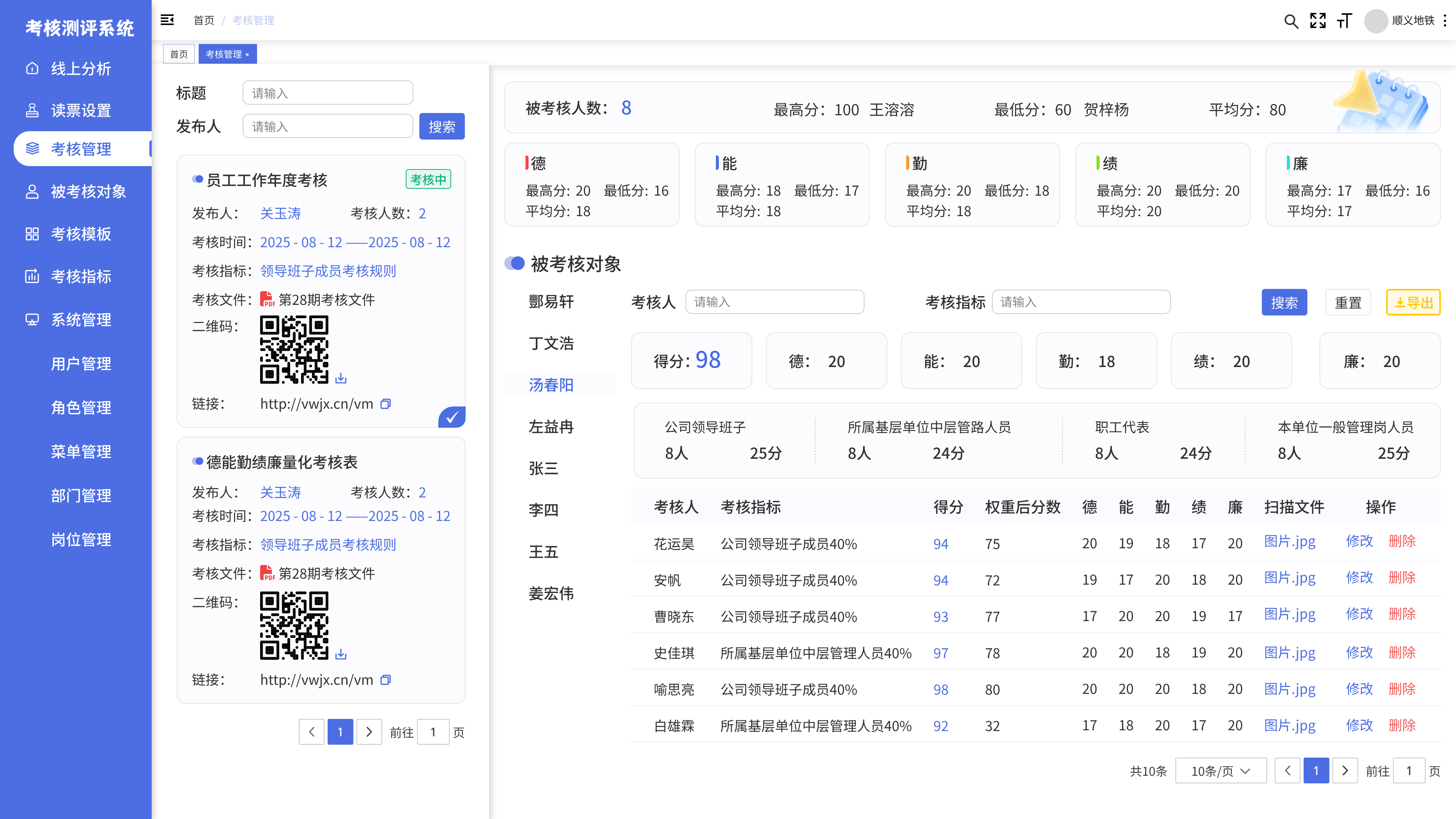 录入被考核人,支持单个新增、批量导入(Excel 模板),读票时选择被考核人,然后通过高速扫描仪读取测评卡数据,系统按照既定统分规则算出被考核人单项得分和最终得分最高分,最低分,平均分。