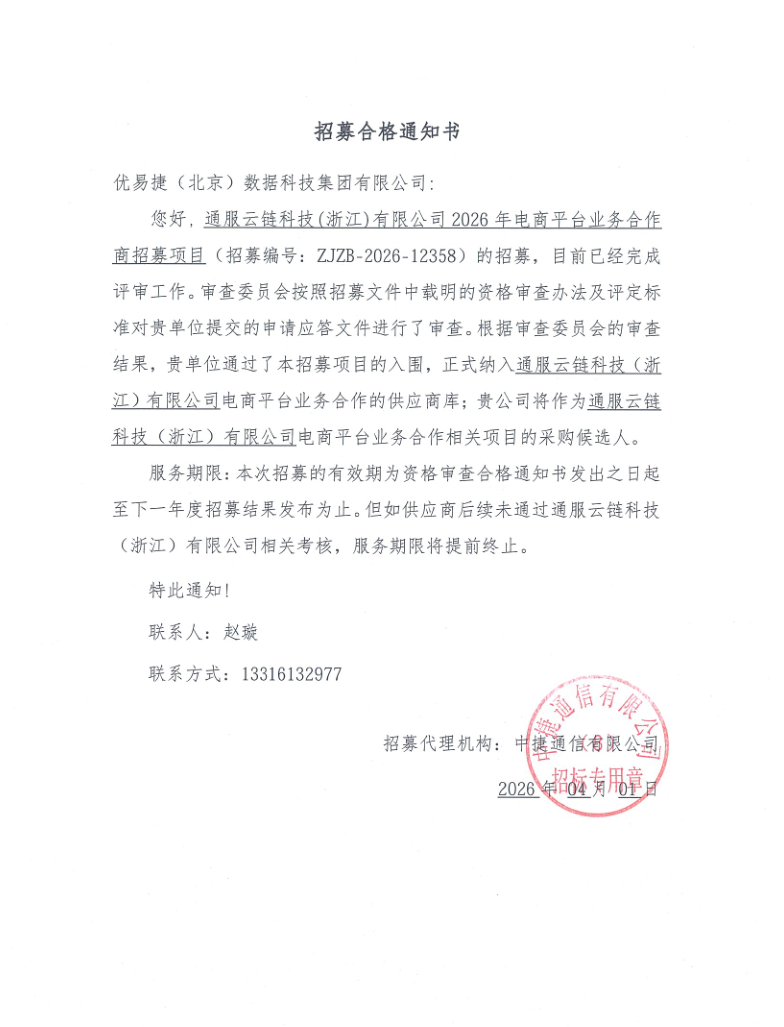 优易捷(北京)数据科技集团有限公司通过通服云链(浙江)有限公司2026年电商平台业务合作招募项目,招募编号:ZJZB-2026-12358